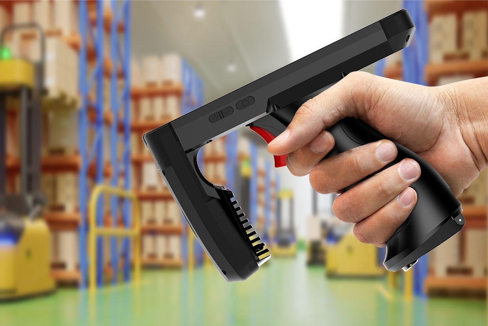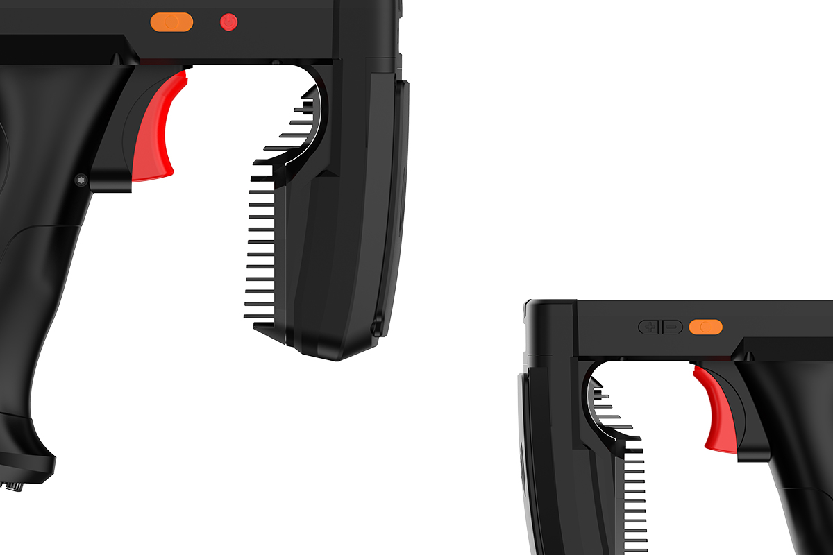 Special design button on grip for easier operation switch. Using button to starting barcode scanning or UHF RFID reading do improve the working efficiency dramatically.